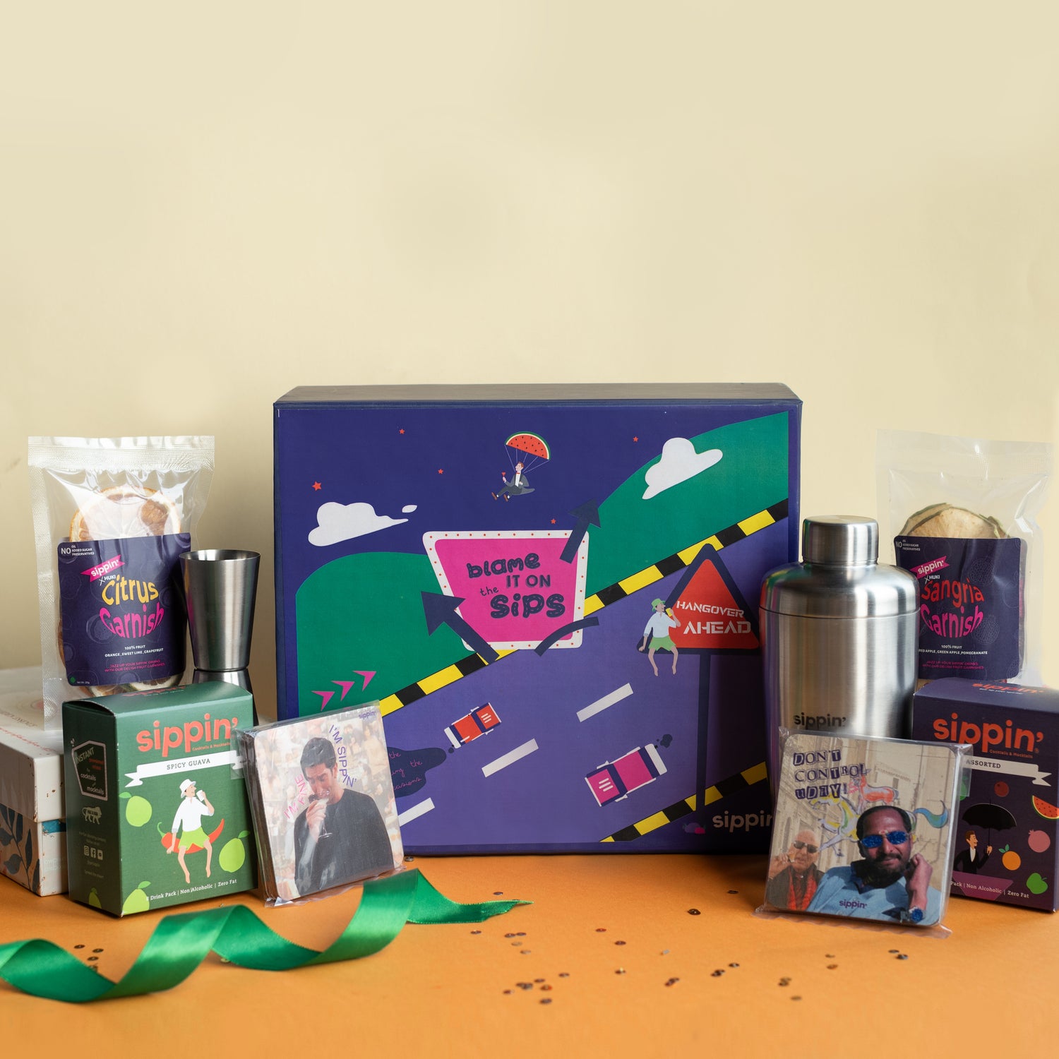 In the box: Shaker, Peg Measurer, Coaster, 1 Assorted box (8 drinks) and 1 Spicy Guava (8 drinks)