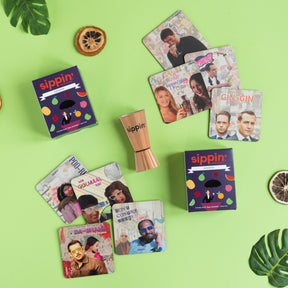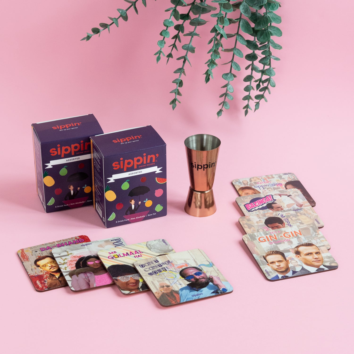 Contents: Bollywood & Hollywood pun coaster set + Peg Measure + 2 Assorted Mixer Packs (Makes 16 drinks)