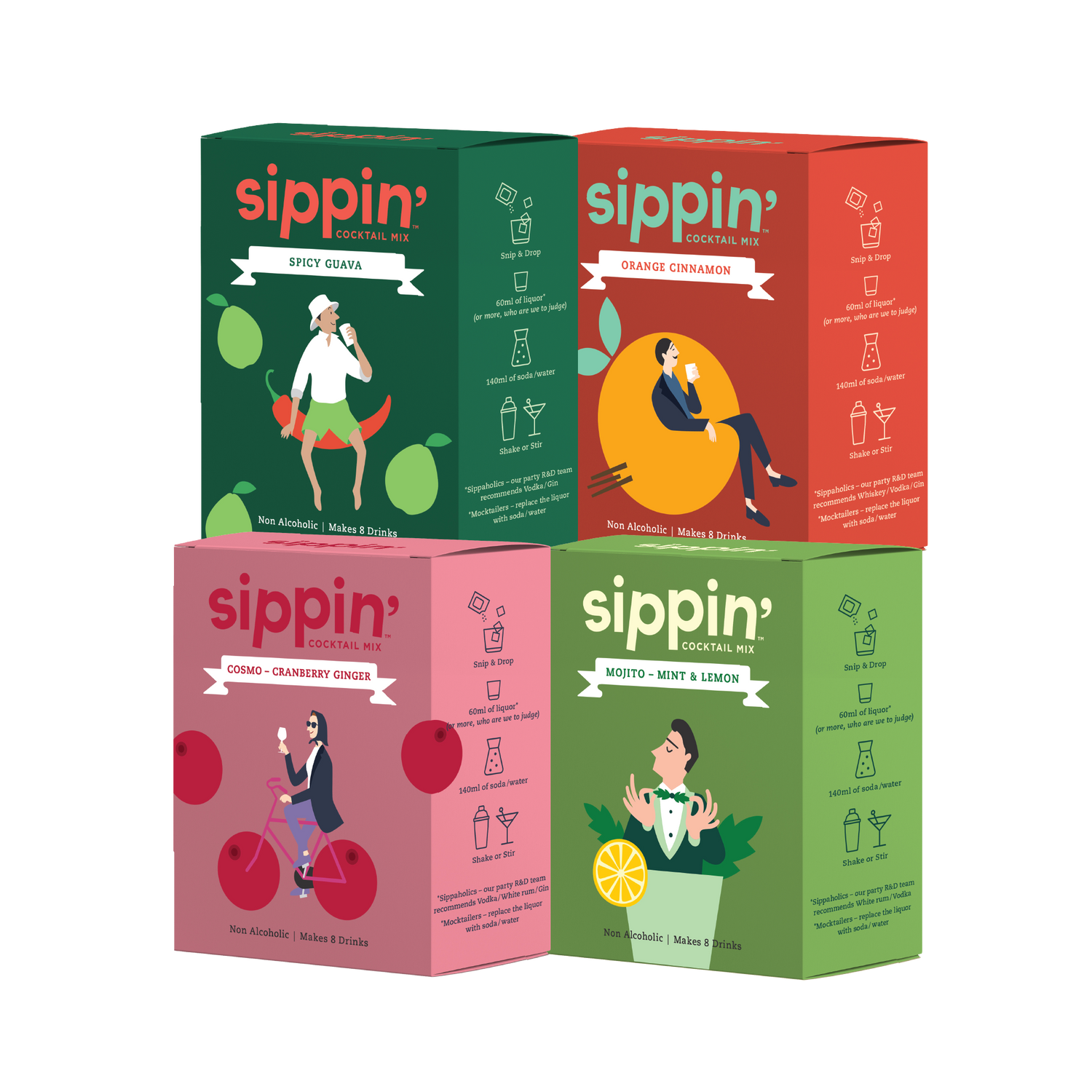 Contents: 1 Cranberry Ginger Pack, 1 Spicy Guava Pack, 1 Mojito Pack, 1 Orange Cinnamon Pack (Makes 32 drinks)