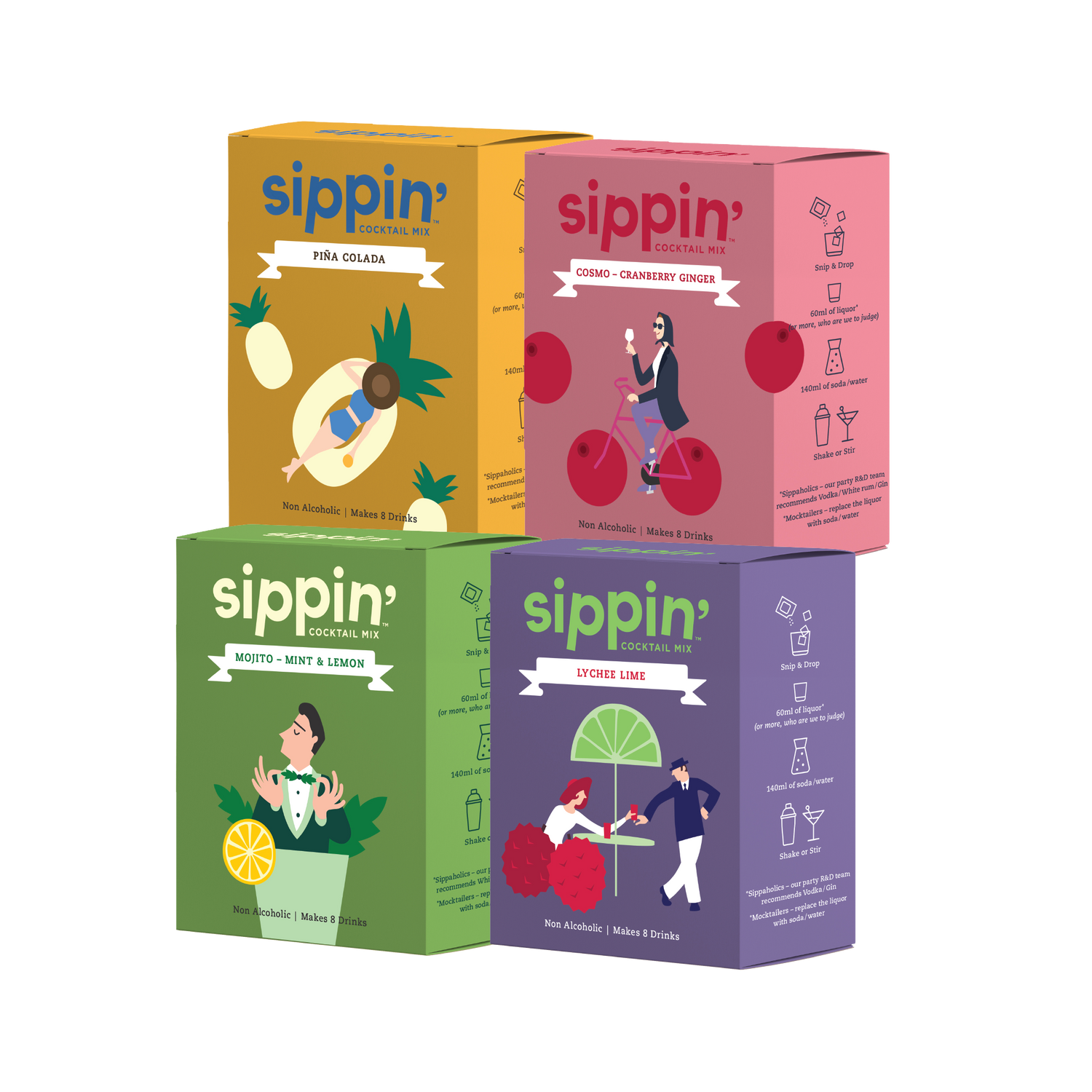 Contents: 1 Mojito Pack, 1 Pina Colada Pack, 1 Lychee Lime Pack, 1 Cranberry Ginger Pack (Makes 32 drinks)